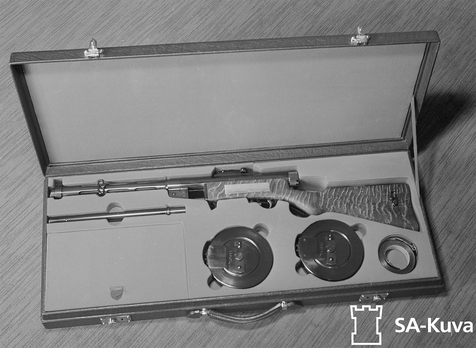 Mannerheimin lahjoittama Suomi-konepistooli. Mukana vaihtopiippu, kaksi lipasta ja kantohihna. Laatikon kannen alla huolto- ja puhdistusvälineet, sekä luistin varajousi.
