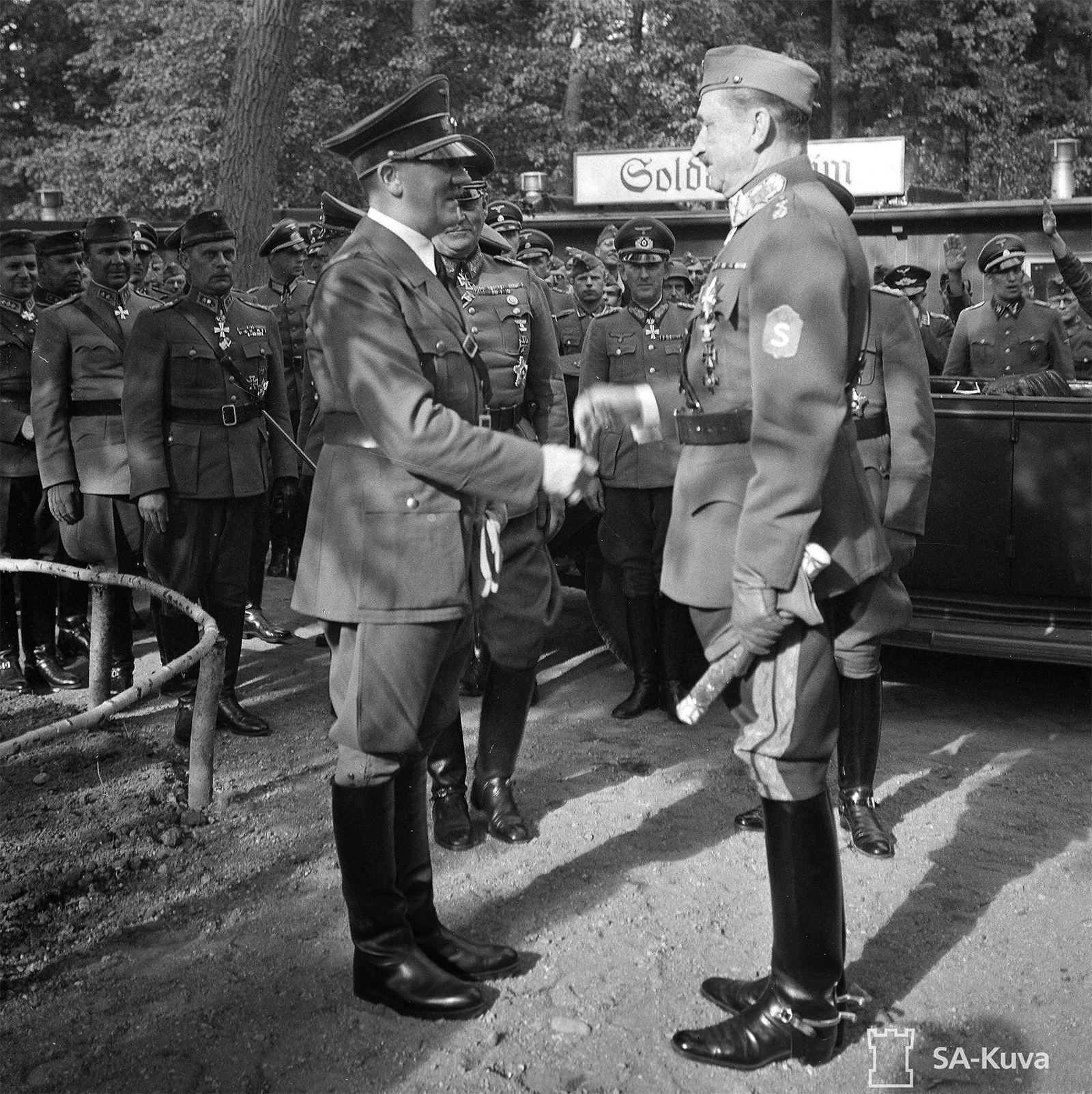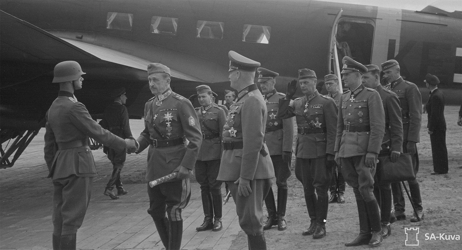 Suomen marsalkka C.G.E. Mannerheim kättelee saksalaisen kunniakomppanian päällikköä. Kuvassa myös Generalfeldmarschall Wilhelm Keitel, kenraalimajuri Rudolf Schmundt, kenraali Waldemar Erfurth sekä suomalaisvaltuuskunnan upseereita.