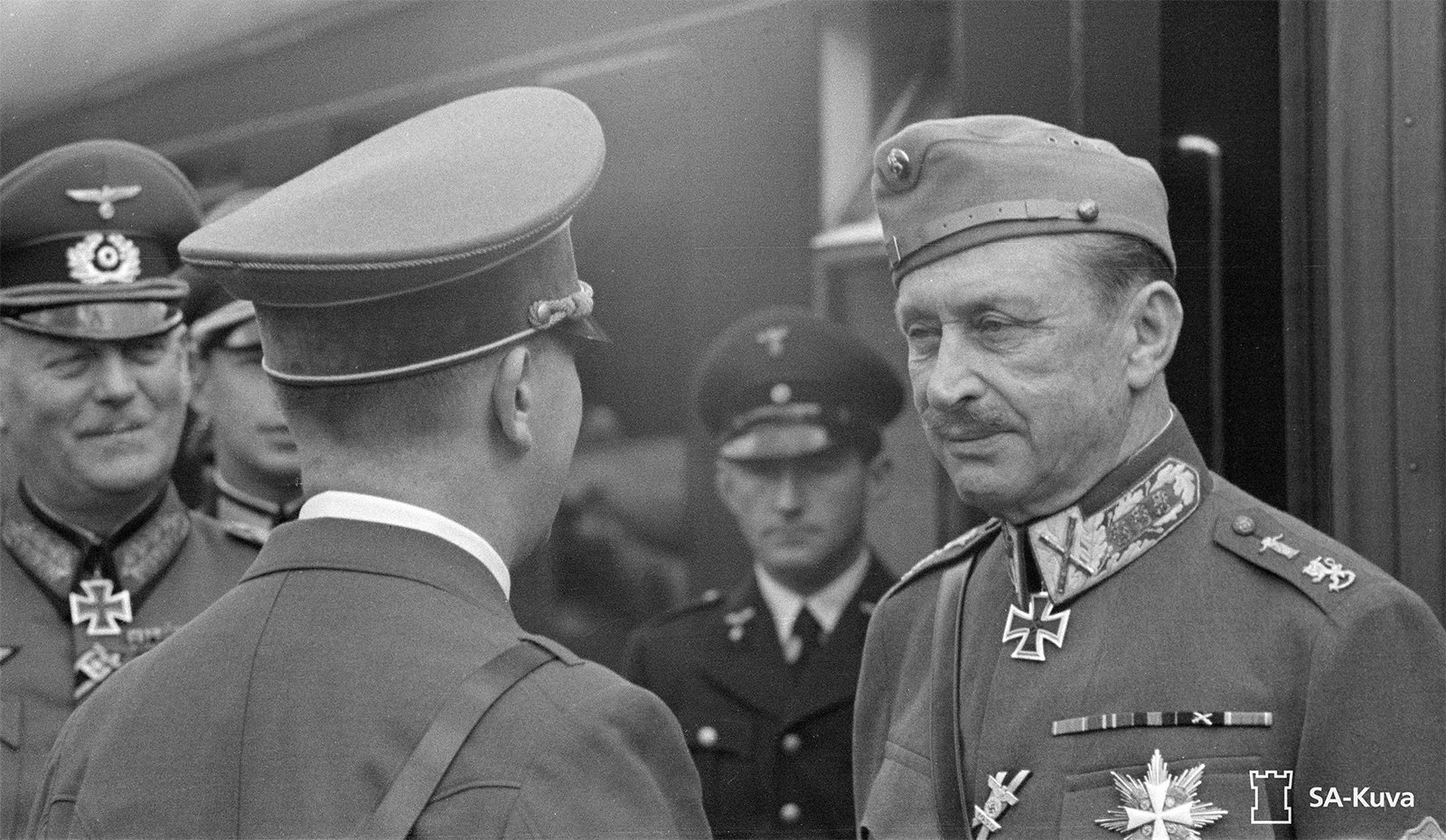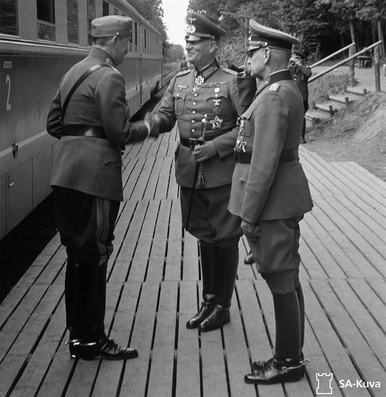 Mauerwaldin rautatiepysäkin puulaiturilla marsalkka Mannerheimiä vastassa olivat Generalfeldmarschall Wilhelm Keitel ja Generaloberst Franz Halder.