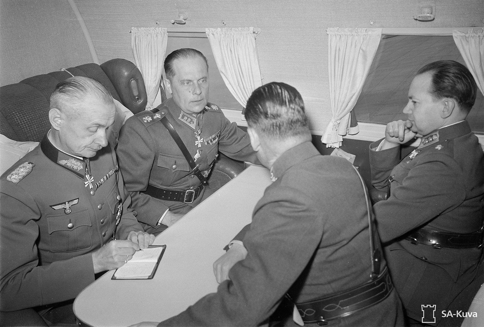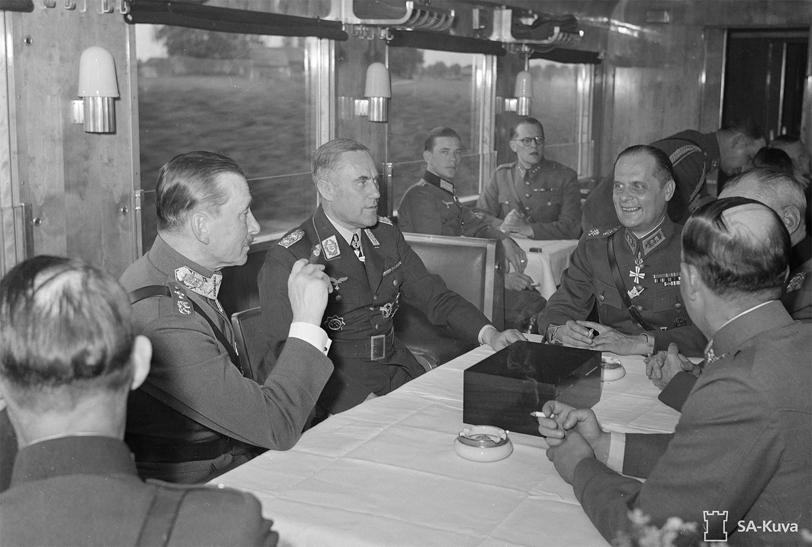 Marsalkka Mannerheim polttaa sikaria junamatkan aikana. Kuvassa marsalkka Mannerheim, General der Flieger Karl Bodenschatz Karl Bodenschatz, kenraaliluutnantti W.E. Tuompo ja kenraali Waldemar Erfurth.