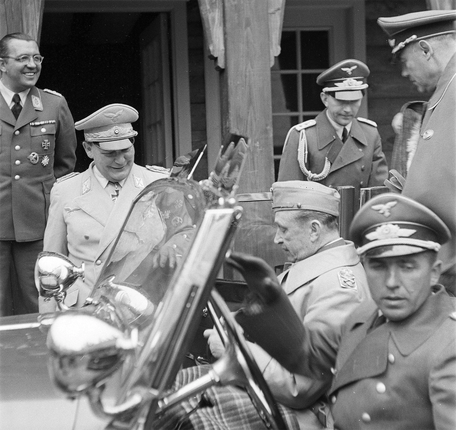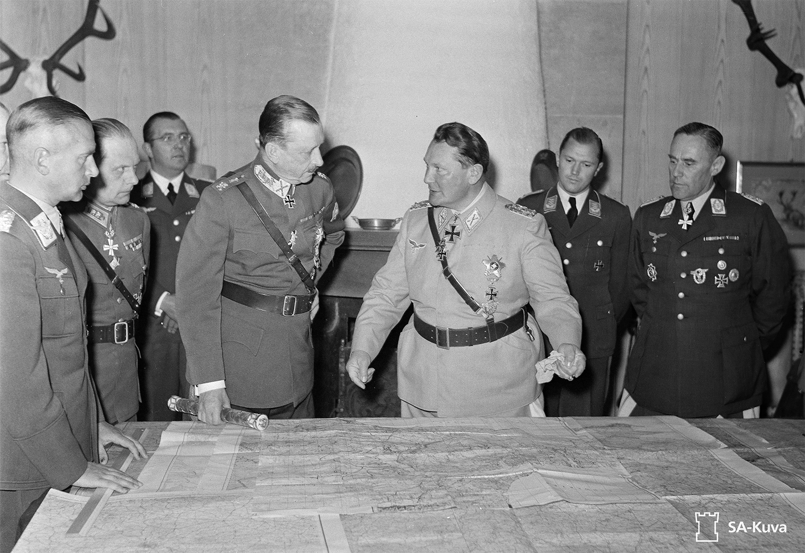 Mannerheim ja Göring, Reichsjägerhofin karttahuoneessa 27.6.1942. Kuvassa ovat ainakin ilmavoimien esikuntapäällikkö Generaloberst Hans Jeschonnek, kenraaliluutnantti W.E. Tuompo, Oberstleutnant Werner Leuchtenberg ??, marsalkka C.G.E. Mannerheim, Reichsmarschall Hermann Göring, Göringin adjutantti Hauptmann Bernd von Brauchitsch ja General der Flieger Karl Bodenschatz.