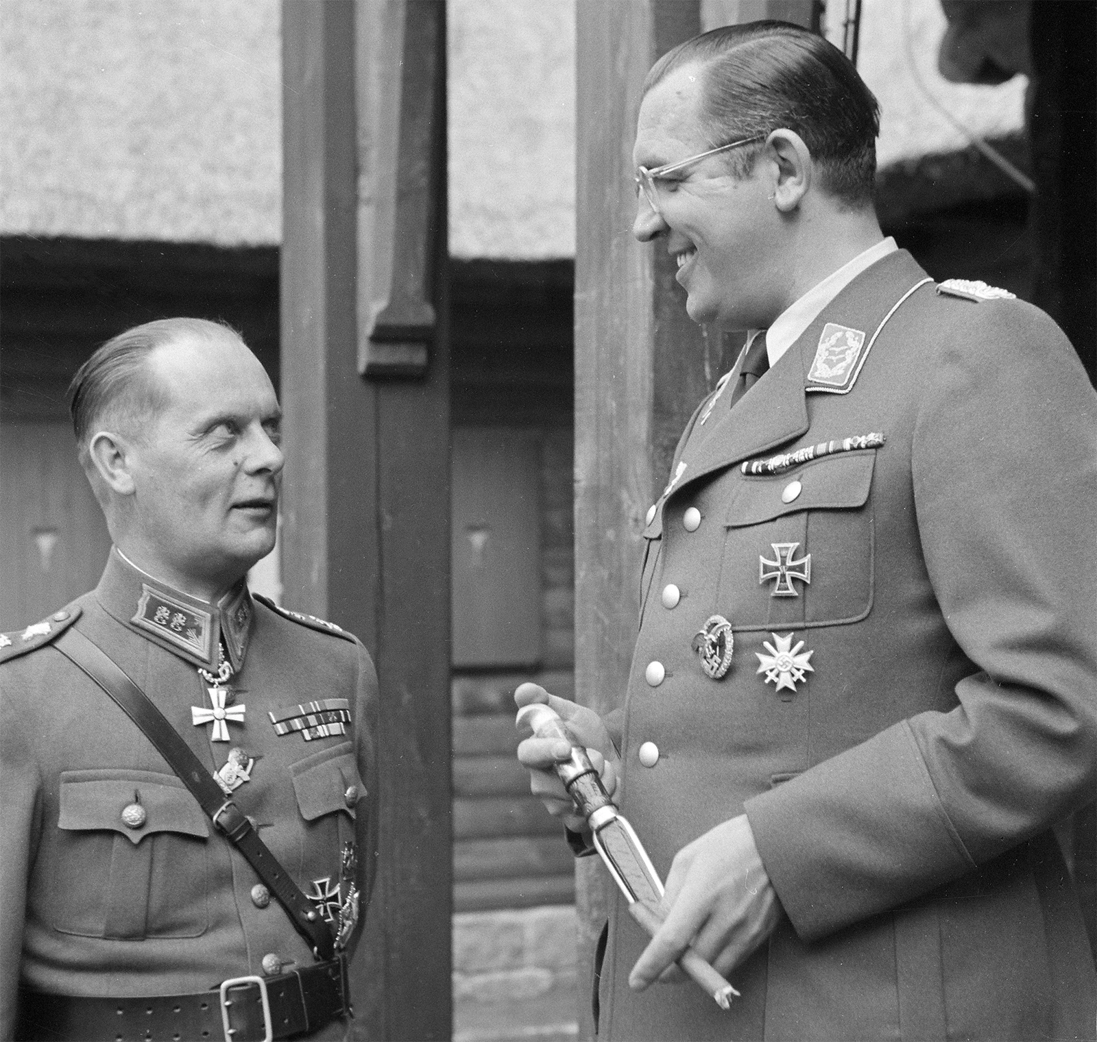 Kuvassa kenraaliluutnantti W.E. Tuompo ja Luftwaffen Oberstleutnant Iisakki Järvenpään valmistama AKS-puukko kädessään.
